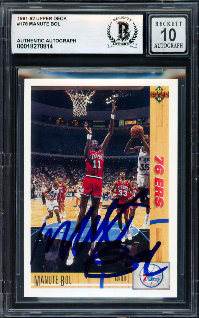 Manute Bol Autographed 1991-92 Upper Deck Card #178 Philadelphia 76ers Auto Grade Gem Mint 10 Beckett BAS #18278814