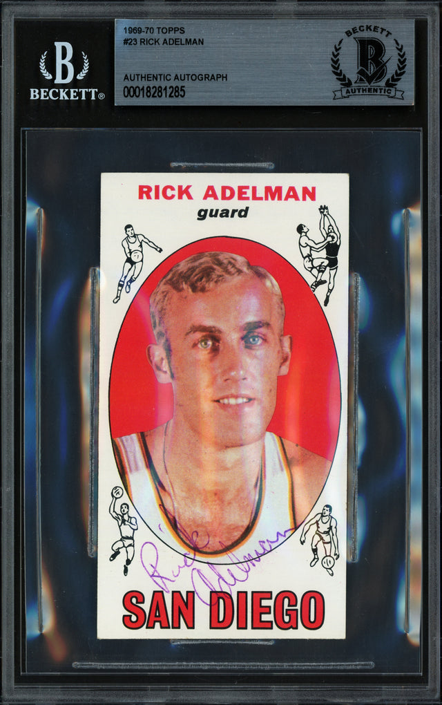 This collectible is an original 1969-70 Topps Rookie Card #23, measuring approximately 2.5x4.75 inches, featuring a bold hand signature from legendary player and coach Rick Adelman. Authenticated and encapsulated by the trusted Beckett Authentication Services (BAS), this card offers both historic significance and verified authenticity for serious collectors and NBA fans alike.