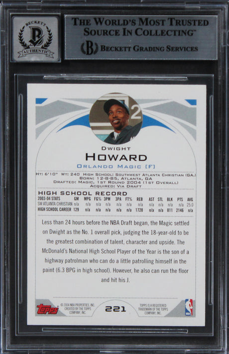 Magic Dwight Howard Authentic Signed 2004 Topps #221 Card BAS Slabbed
