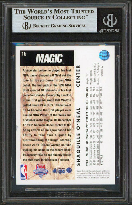 Magic Shaquille O'Neal Signed 1992 Upper Deck #1B Rookie Card BAS Slabbed