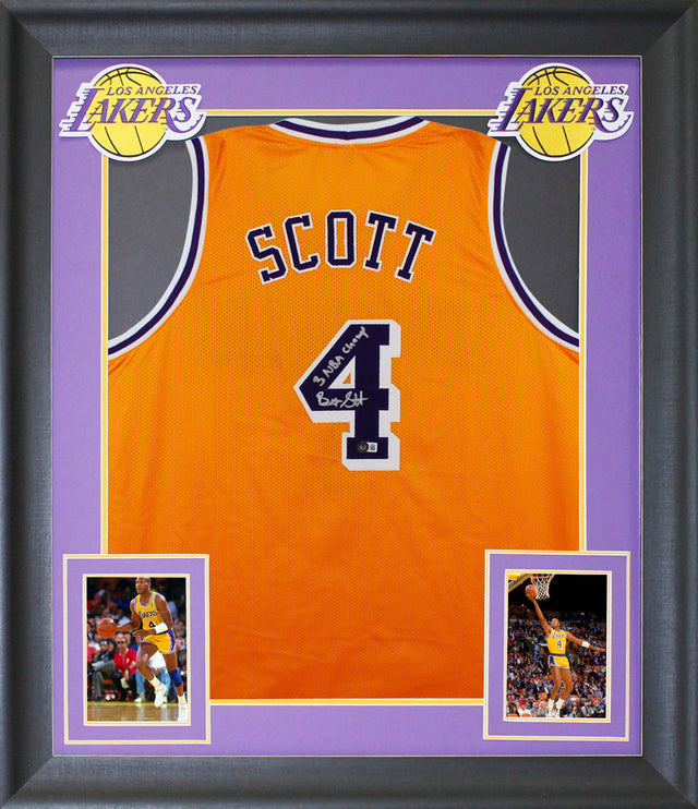 This Autographed Yellow Pro-Style Framed Jersey has been personally signed by Byron Scott of the Los Angeles Lakers and comes with the special inscription "3x Champ." A true collector’s item, this framed jersey celebrates Scott's contributions to the Lakers' championship legacy. This jersey is 100% authentic and includes a Beckett Authentication Services (BAS) hologram with a scannable QR code for verification. As part of the BAS Witnessed Protection Program, a Beckett representative was present during the signing, ensuring authenticity. Please note that Beckett no longer provides serial-numbered COA cards; the affixed BAS sticker serves as the complete authentication. Product Features: