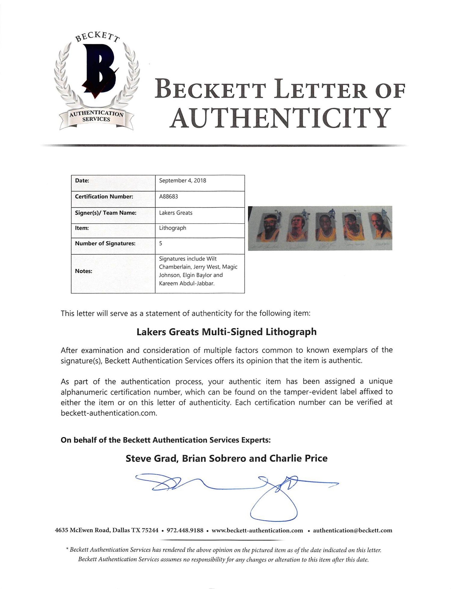 Lakers Legends (5) Chamberlain, Jabbar, Johnson Signed 22x39 Lithograph BAS is backordered and will ship as soon as it is back in stock.