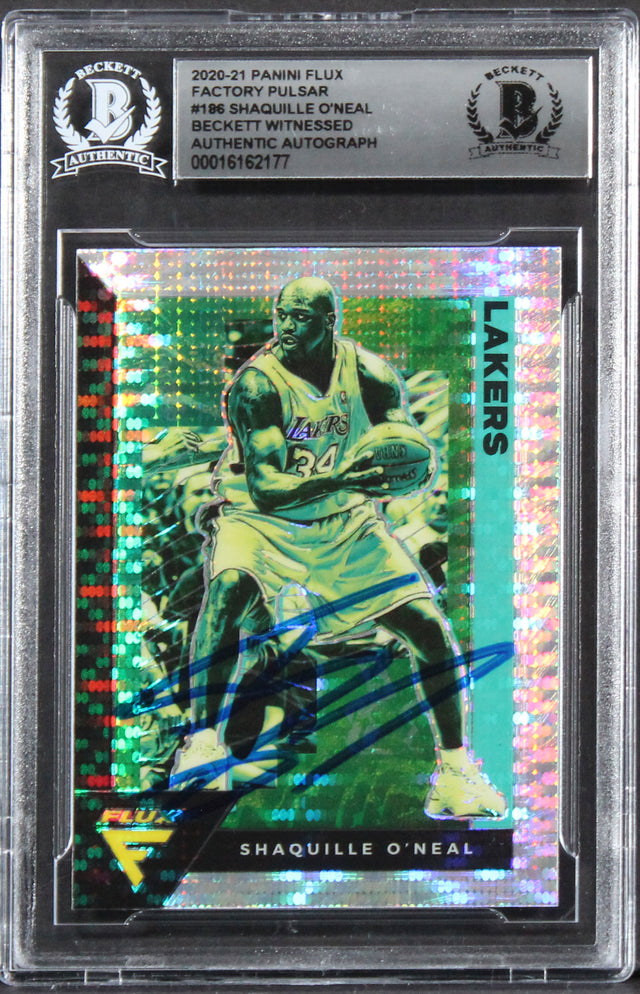 Own a piece of basketball history with this Autographed 2020 Panini Flux Factory Pulsar #186 Card, personally signed by Shaquille O'Neal of the Los Angeles Lakers. This highly collectible item is 100% authentic and has been professionally slabbed and authenticated by Beckett Authentication Services (BAS), ensuring its legitimacy for serious collectors and fans alike.