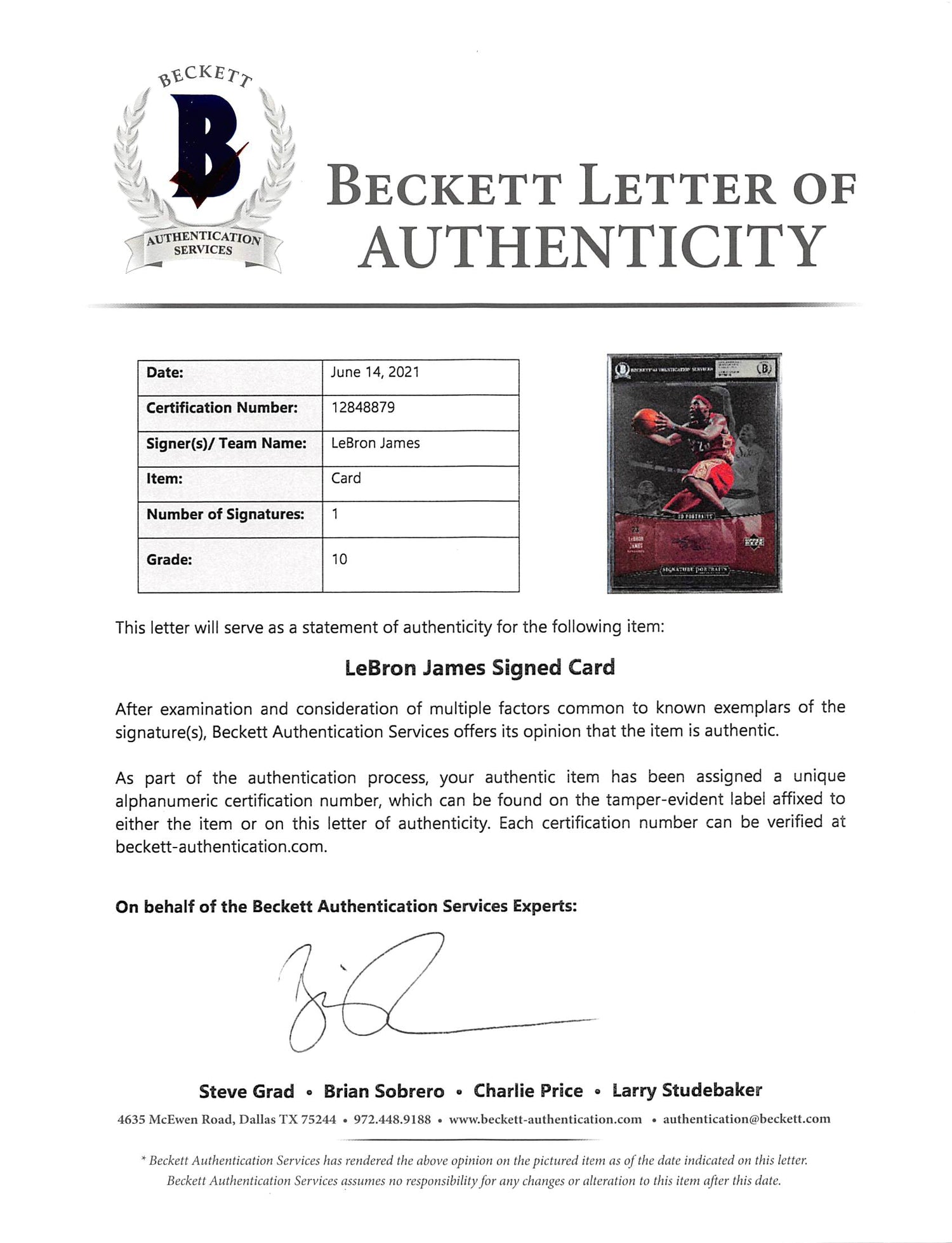 This slabbed and certified LeBron James autographed card is a prized addition for collectors and Cavaliers fans looking to celebrate the legacy of an NBA legend. Authentication can be verified on the Beckett Authentication Services website. Don't miss your chance to own this exclusive signed memorabilia!