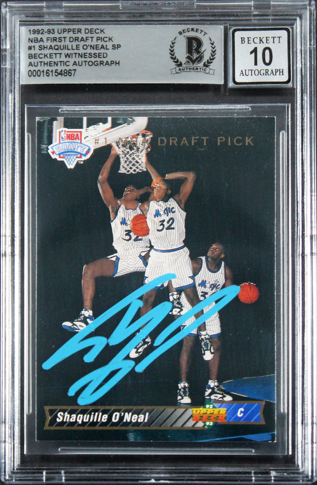 Own a piece of basketball history with this Autographed Auto Graded Gem Mint 10! 1992 Upper Deck NBA First Draft Pick #1 Rookie Card, personally signed by Shaquille O'Neal of the Orlando Magic. This rare collectible is a must-have for serious collectors and NBA fans alike.