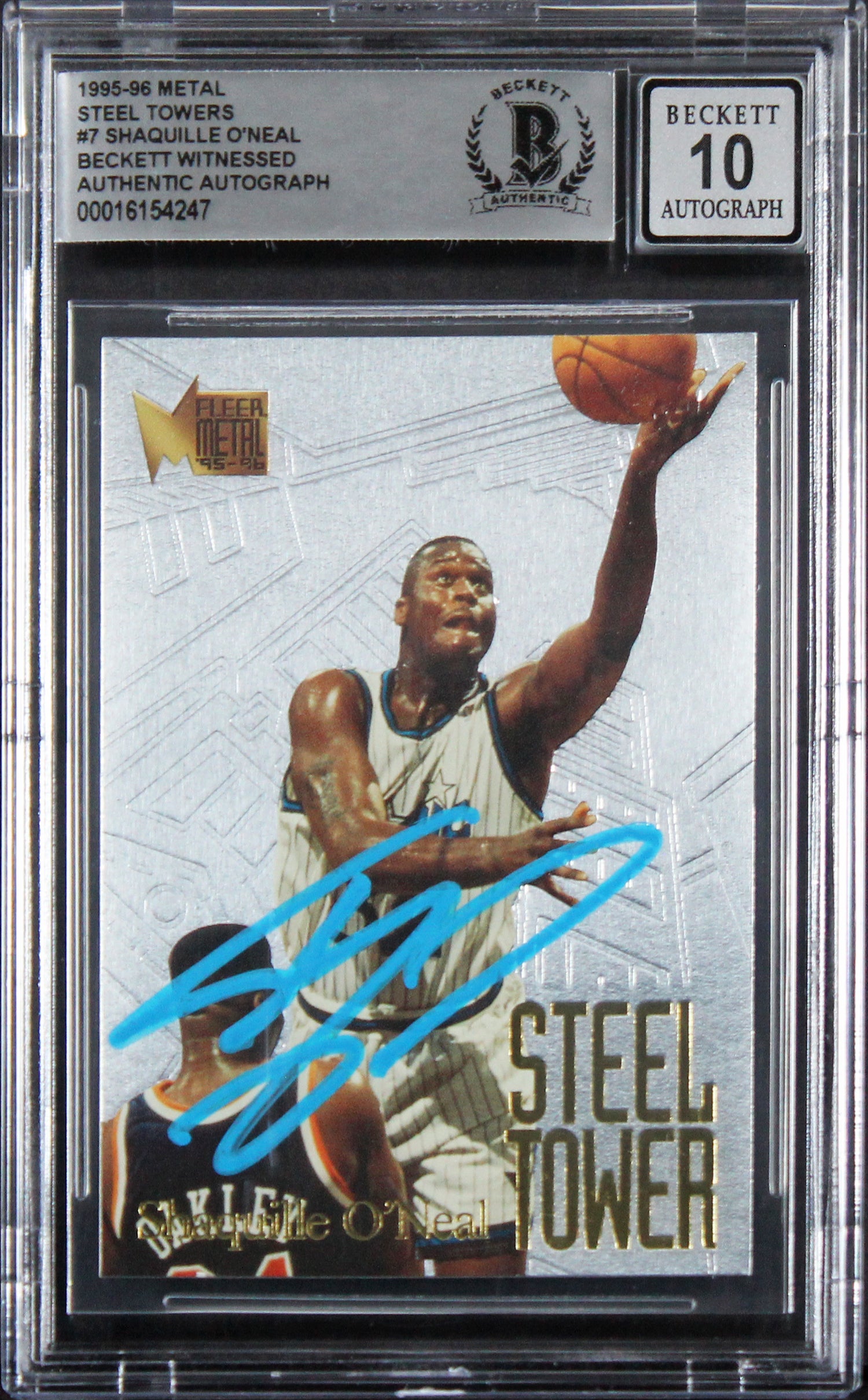 Own a piece of basketball history with this Autographed Auto Graded Gem Mint 10! 1995 Metal Steel Towers #7 Card, personally signed by Shaquille O'Neal during his legendary time with the Orlando Magic. This rare collector's item is 100% authentic, slabbed, and authenticated by Beckett Authentication Services (BAS), ensuring its value and integrity for serious collectors and fans alike.