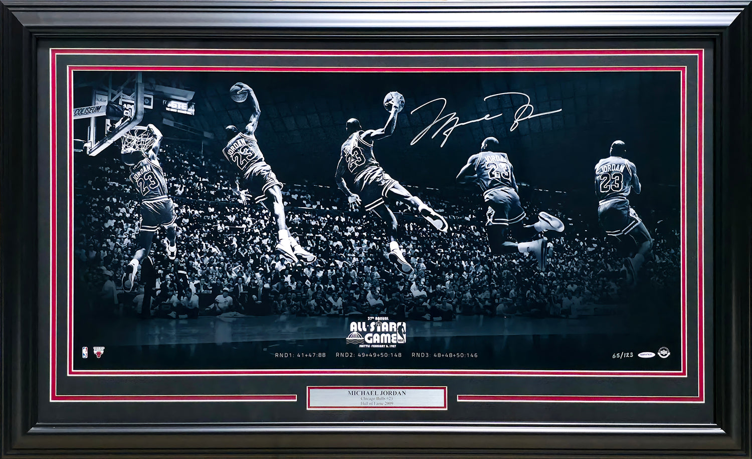 Michael Jordan Autographed Framed 18x36 'Kiss the Rim' Photo Chicago Bulls 1987 NBA Slam Dunk Contest #65/123 UDA Holo #BAM147630