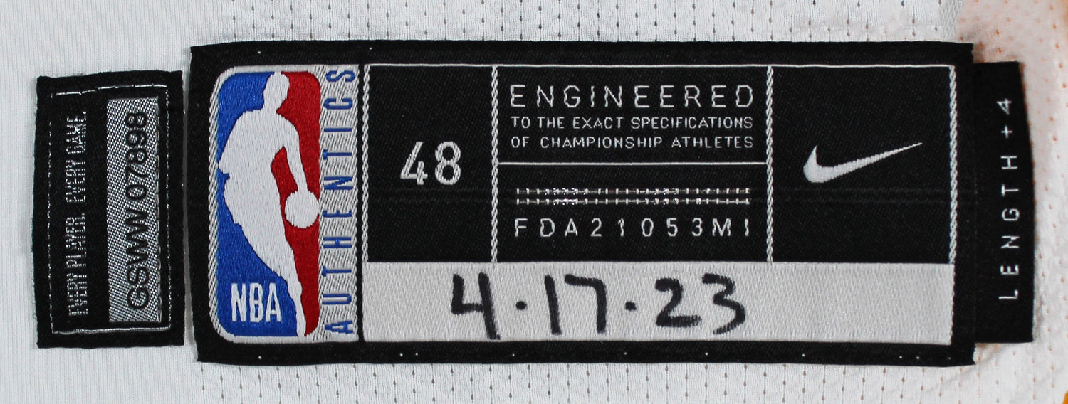 - Embroidered Nike NBA AUTHENTICS size "48" tag with an attached "+4 Length" flag on the front left tail.