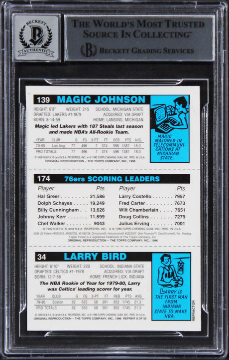 Bird, Erving & Magic Signed 1996 SC Finest Refractors #8 Card Auto 10 PSA Slab