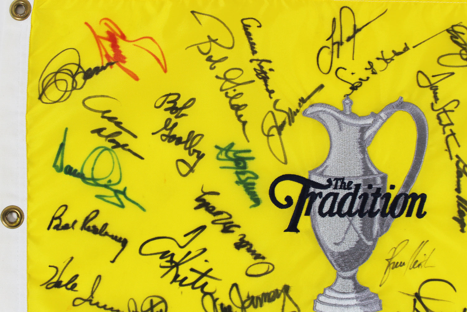 Own a true piece of golf history with this Autographed Traditions Pin Flag, personally signed by some of the greatest names in the sport. This rare collectible features signatures from legendary golfers, including Jack Nicklaus, Gary Player, Hale Irwin, Tom Kite, Fuzzy Zoeller, Tony Jacklin, Charlie Sifford, and many more. Whether you're a dedicated fan, historian, or collector, this flag is a must-have addition to your memorabilia collection.