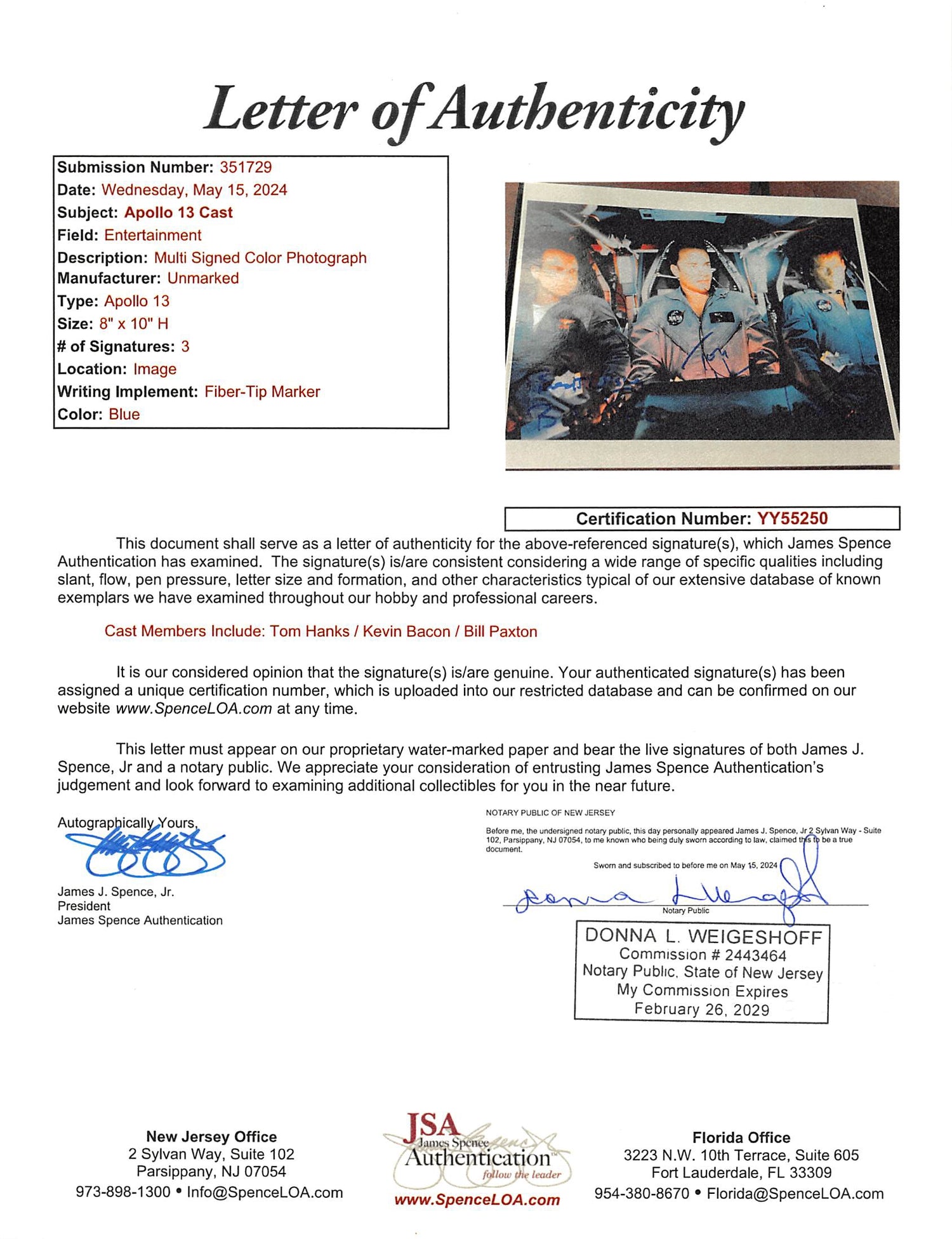 Apollo 13 (3) Hanks, Paxton & Bacon Authentic Signed 8x10 Photo JSA #YY55250