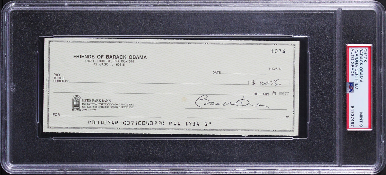 Barack Obama Authentic Signed 3x8 Check Auto Graded Mint 9! PSA/DNA Slabbed