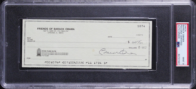 Own a remarkable piece of history with this Autographed Auto Graded Mint 9! 3x8 Friends of Barack Obama Check, personally signed by Barack Obama. This rare collectible is a must-have for political memorabilia enthusiasts and history buffs alike. Fully authenticated and encapsulated by PSA/DNA, this check is preserved in pristine condition, ensuring long-term value and authenticity.