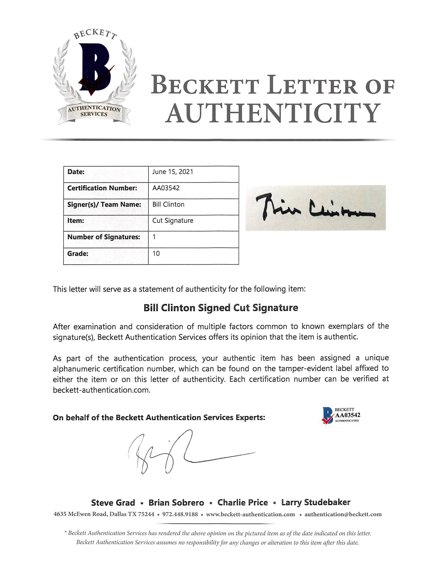 Own an extraordinary piece of history with this Autographed Auto Graded Gem Mint 10! 5.5x6.5 Cut Signature, personally signed by Bill Clinton, the 42nd President of the United States. A must-have for political memorabilia collectors and history enthusiasts alike, this rare signature is authenticated by Beckett Authentication Services for complete peace of mind.