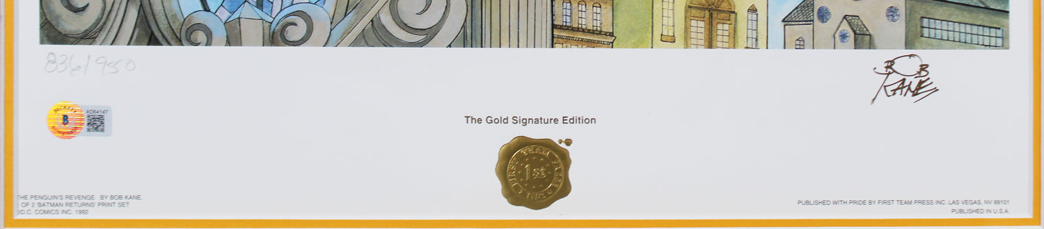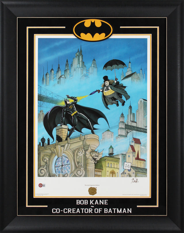 Own a rare piece of Batman history with this Autographed The Gold Signature Limited Edition #836/950 & Framed 20.5x24.5 Lithograph, personally signed by Bob Kane, the legendary creator of Batman. This stunning collectible is an essential addition for any comic book fan or memorabilia collector.