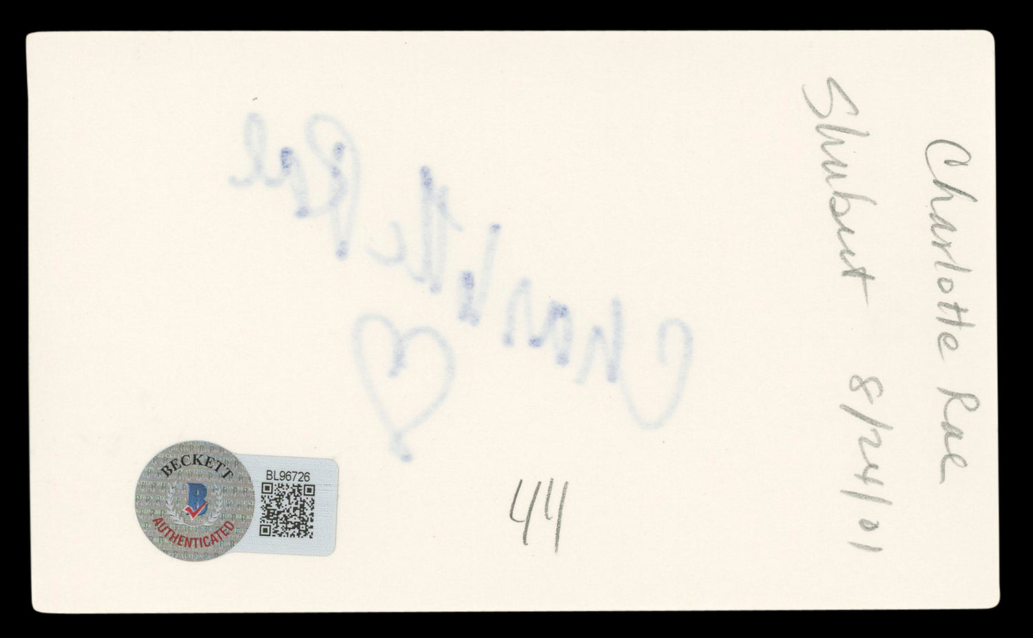 This signed Charlotte Rae index card is a timeless treasure, perfect for dedicated TV history enthusiasts and memorabilia collectors. Authentication details can be verified directly on the Beckett Authentication Services website for added peace of mind. Don't miss your chance to own this nostalgic piece of entertainment history!