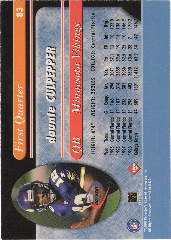 - 1999 Edge Odyssey Rookie Card #83 – A rare rookie card capturing Culpepper’s first year in the NFL with the Minnesota Vikings.