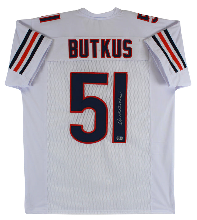 Own a piece of football history with this Autographed White Pro Style Jersey, personally signed by Dick Butkus, the legendary linebacker of the Chicago Bears. A must-have for collectors and fans alike, this jersey comes with full authenticity from Beckett Authentication Services (BAS), ensuring its genuineness.