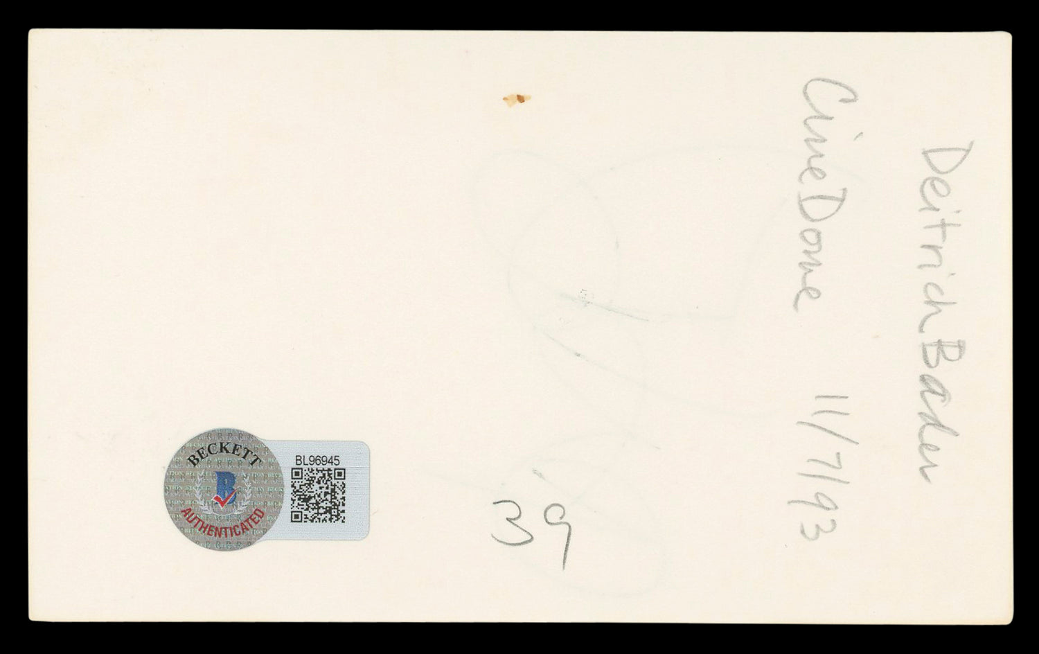 Please note that Beckett no longer provides serial-numbered COA cards. The affixed BAS sticker serves as the complete authentication. Authenticity can be verified on the Beckett Authentication Services website.