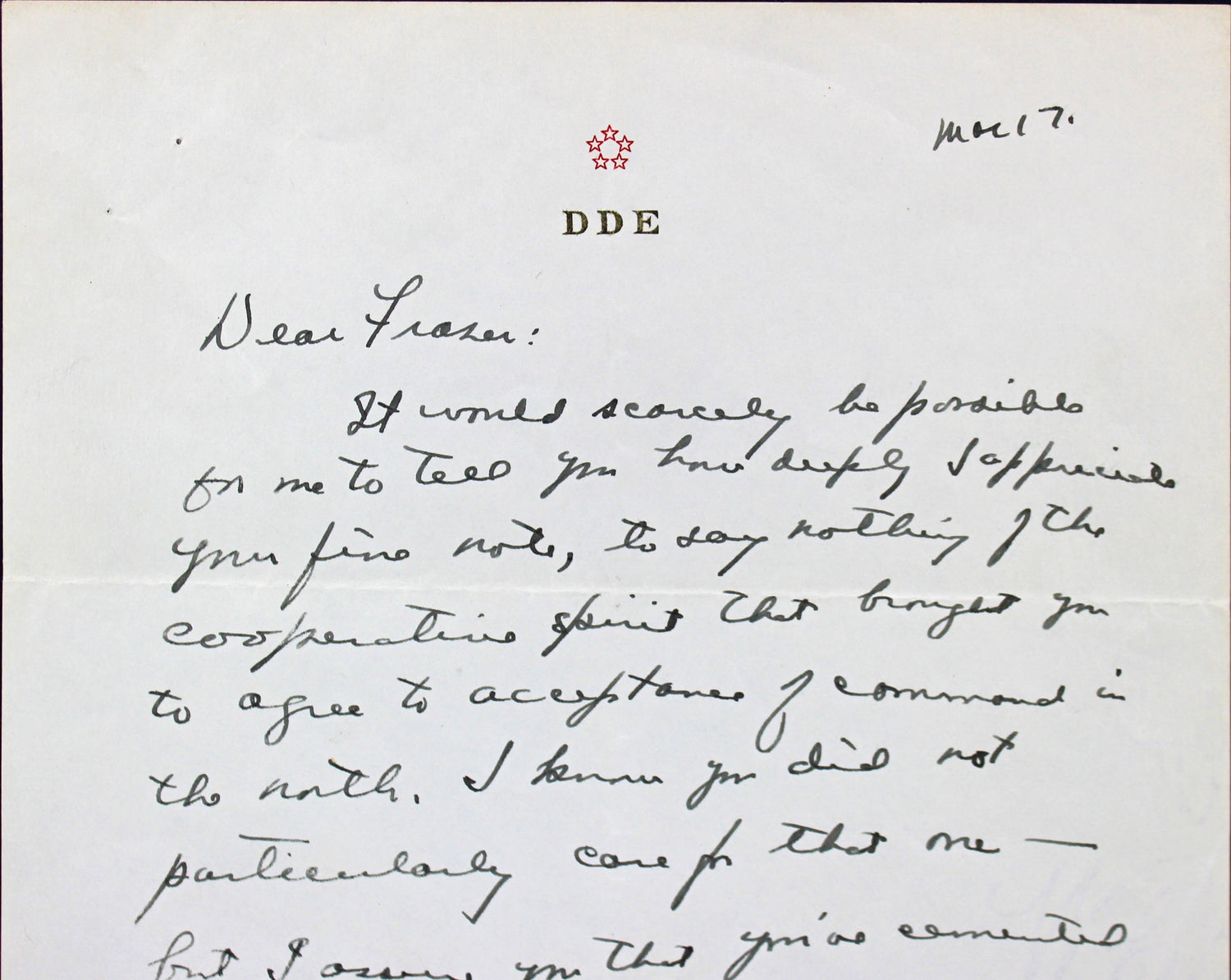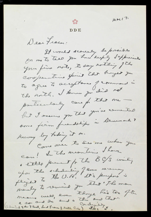 This rare, autographed handwritten letter, personally signed by Dwight D. Eisenhower, is a true collectible piece of history. Written on his personal stationery and dated March 7, this 7x10.25-inch letter is addressed to British Admiral of the Fleet, Bruce Fraser. It reflects Eisenhower’s personal and professional relationships during and after World War II, offering a fascinating glimpse into the diplomacy and camaraderie of military leadership.