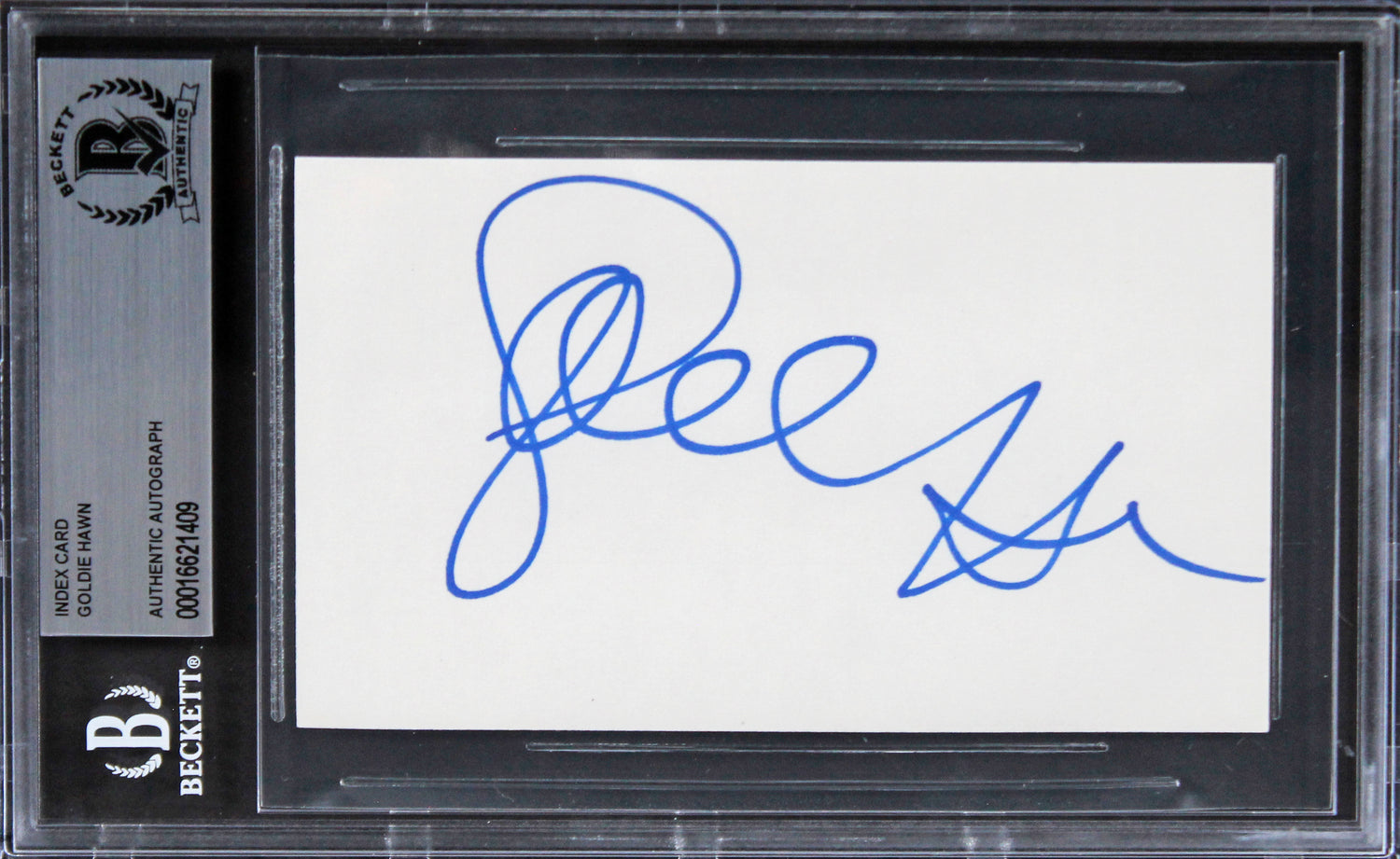 Own a piece of Hollywood history with this Goldie Hawn Autographed 3x5 Index Card, personally signed by the iconic actress known for her role in Overboard. This collectible is a must-have for fans of classic films and entertainment memorabilia. Authenticated and slabbed by Beckett Authentication Services, ensuring its 100% authenticity, this item is a valuable addition to any collection.