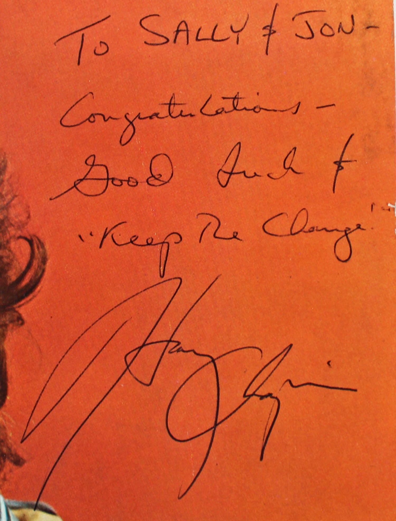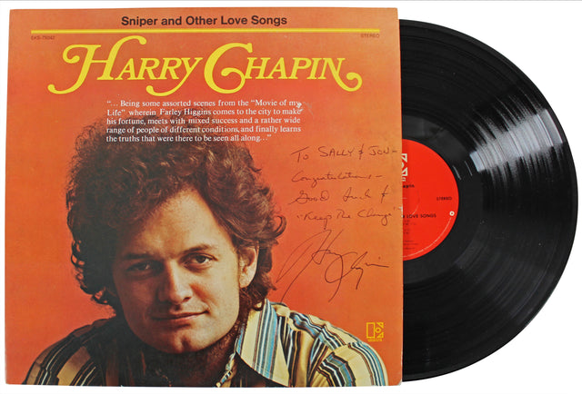 Own a rare piece of music history with this Harry Chapin Autographed Album Cover with Vinyl, featuring a heartfelt inscription: "To Sally & John Congratulations Good Luck & Keep The Change!". This unique collectible is a must-have for fans of the legendary singer-songwriter.