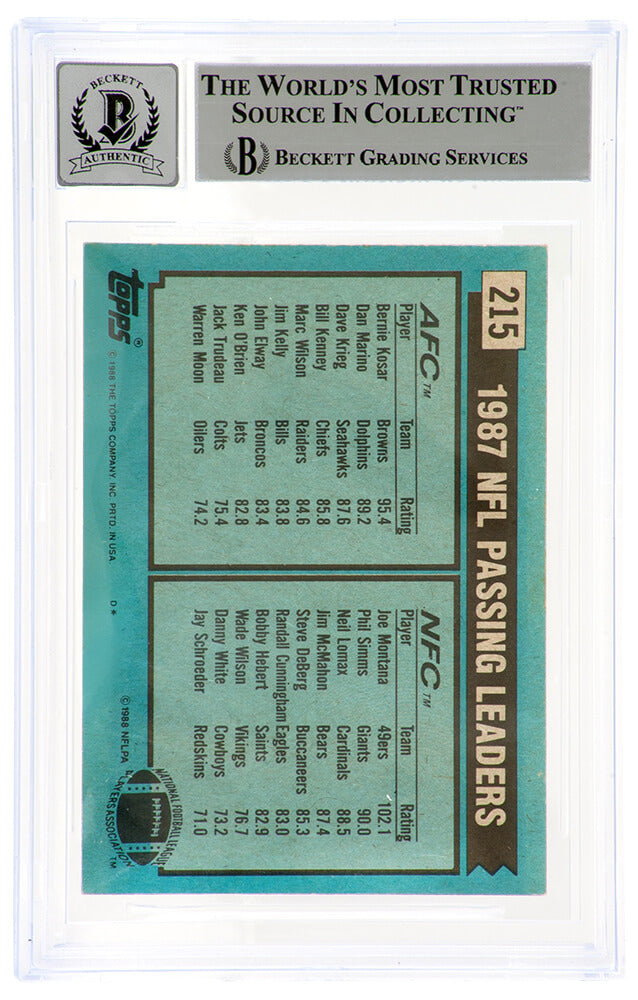 Joe Montana Signed 49ers 1988 Topps NFL Passing Leader Football Trading Card #215 - (Beckett - Auto Grade 10)