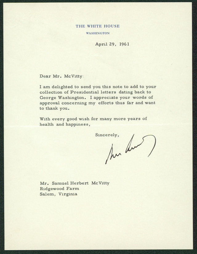Own a rare piece of American history with this John F. Kennedy Autographed Letter, dated April 29, 1961, signed on official White House letterhead. This extraordinary collectible features a personal note from President John F. Kennedy to Samuel Herbert McVitty, acknowledging his collection of Presidential letters dating back to George Washington and expressing appreciation for his support.