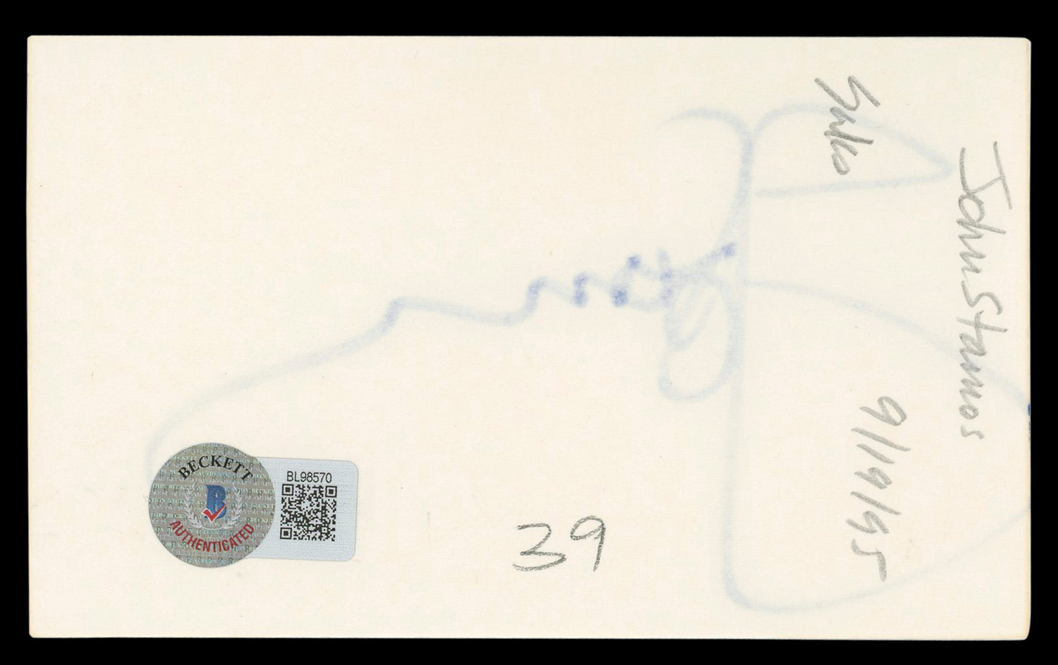 This signed index card’s authenticity is guaranteed by Beckett Authentication Services, a trusted name in memorabilia verification. Please note: Beckett no longer issues serial-numbered COA cards; instead, the affixed BAS sticker serves as full authentication and can be verified on the Beckett website. Don’t miss your chance to own this authentic John Stamos autograph—secure this collectible today!