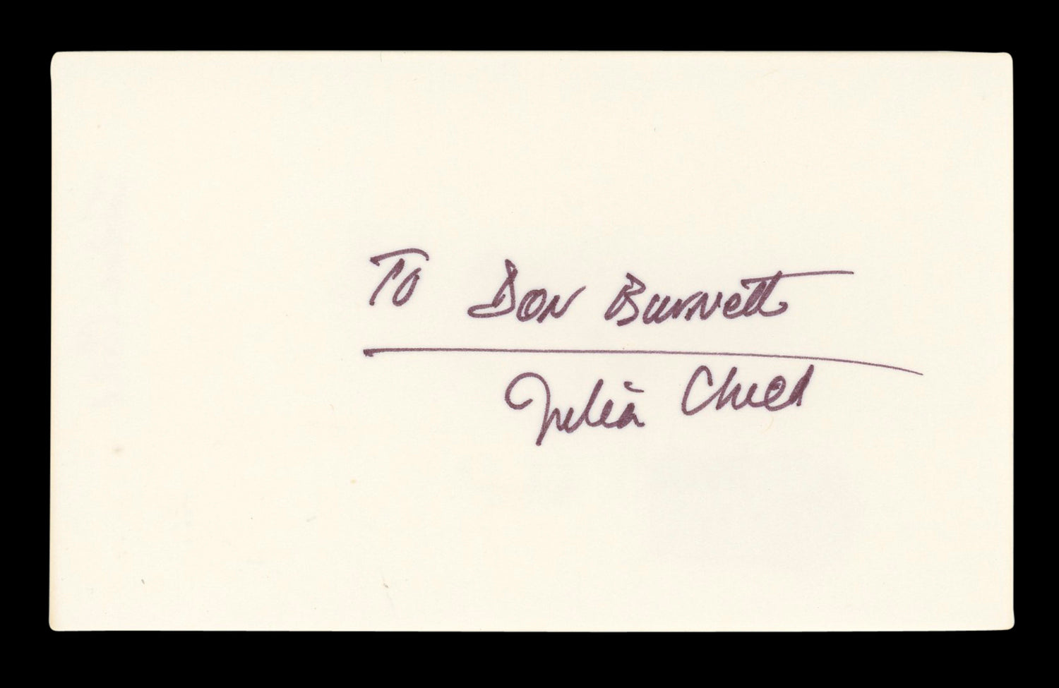 Julia Child Television Host "To Don Burnett" Signed 3x5 Index Card BAS #AD70365
