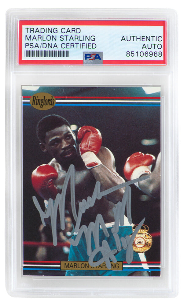 Own a piece of boxing history with this Marlon Starling signed 1991 Ringlords boxing trading card #28. A two-time world champion, Starling was known for his defensive prowess and resilience in the ring. This rare collector's item has been authenticated and encapsulated by PSA/DNA, ensuring its authenticity for serious collectors and boxing fans alike.