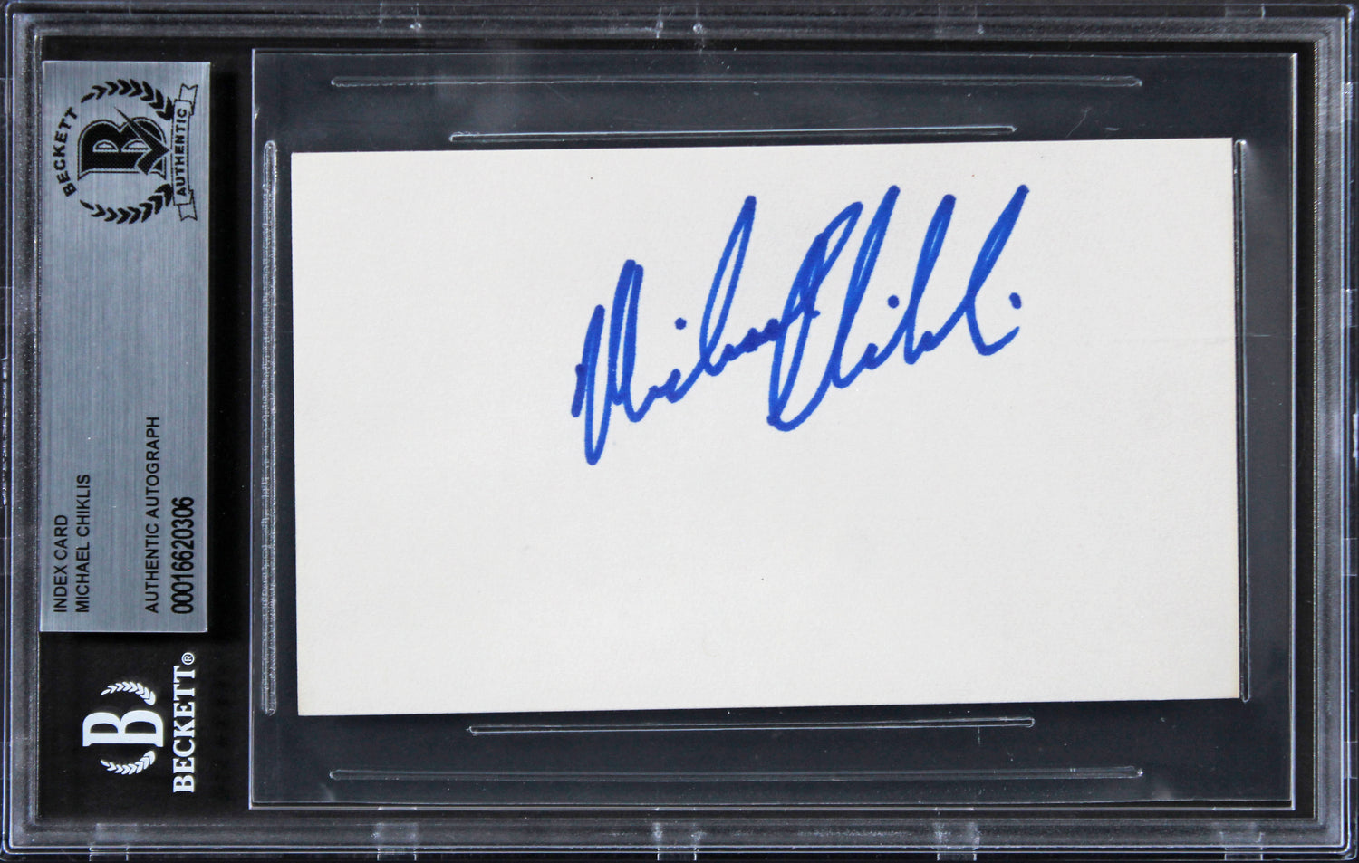Own a piece of television history with this Michael Chiklis Autographed 3x5 Index Card, personally signed by the star of The Shield. This collectible is 100% authentic, slabbed and certified by Beckett Authentication Services (BAS), one of the most trusted names in memorabilia authentication.