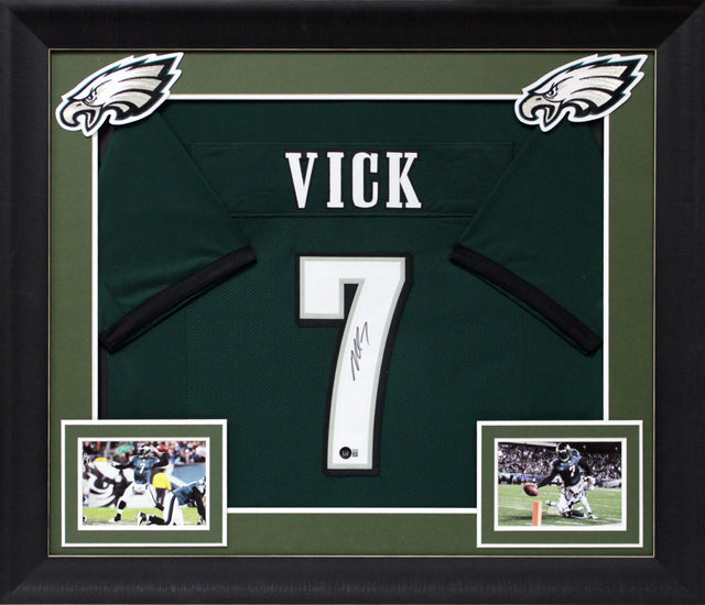 This autographed Green Pro Style Framed Jersey has been personally signed by Michael Vick, legendary quarterback of the Philadelphia Eagles. A must-have for Eagles fans and collectors, this professionally framed jersey is a striking tribute to one of the most electrifying quarterbacks in NFL history.