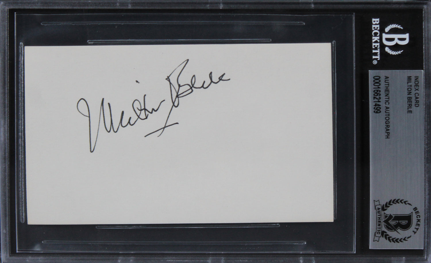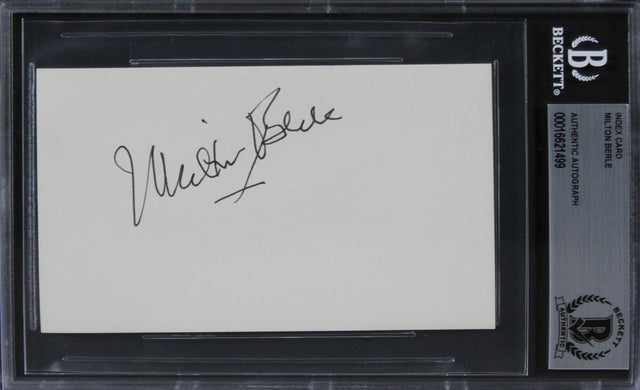 Own a piece of television history with this personally signed Milton Berle autographed 3x5 index card from *The Milton Berle Show*. A true collector’s item, this autograph is 100% authentic and has been professionally slabbed and authenticated by Beckett Authentication Services.