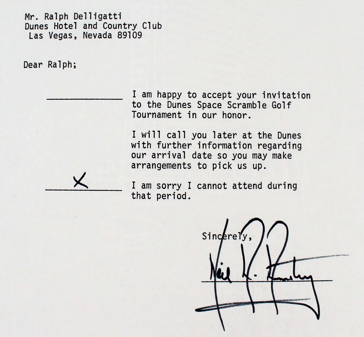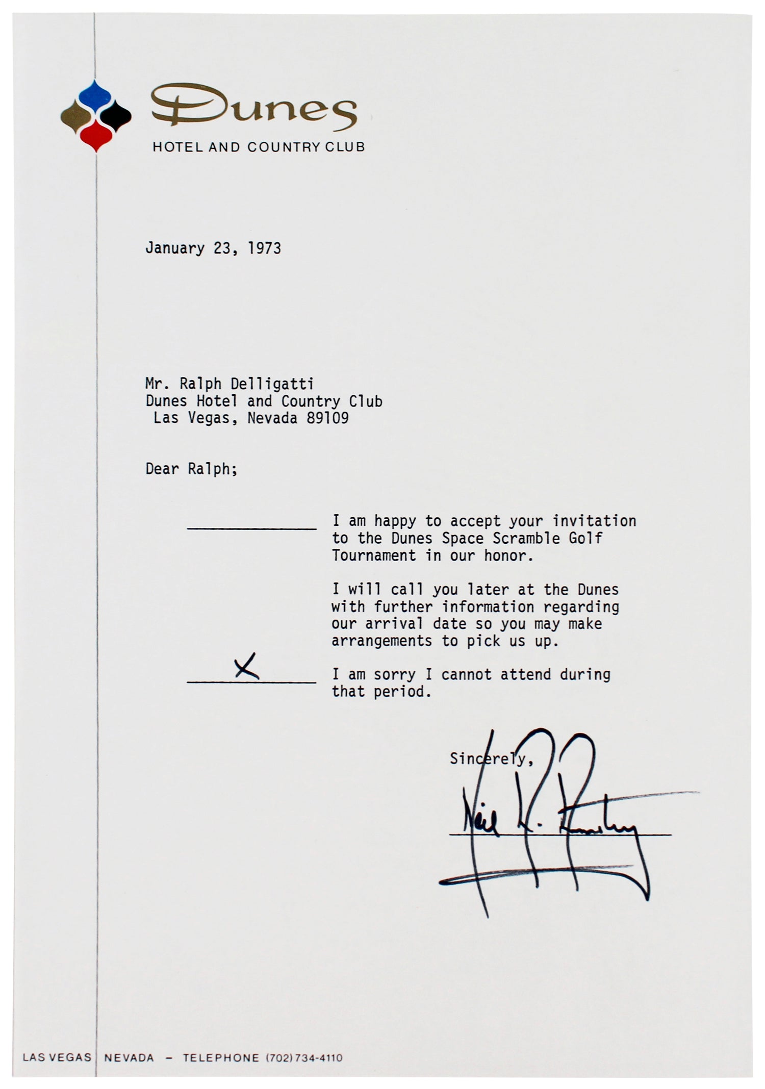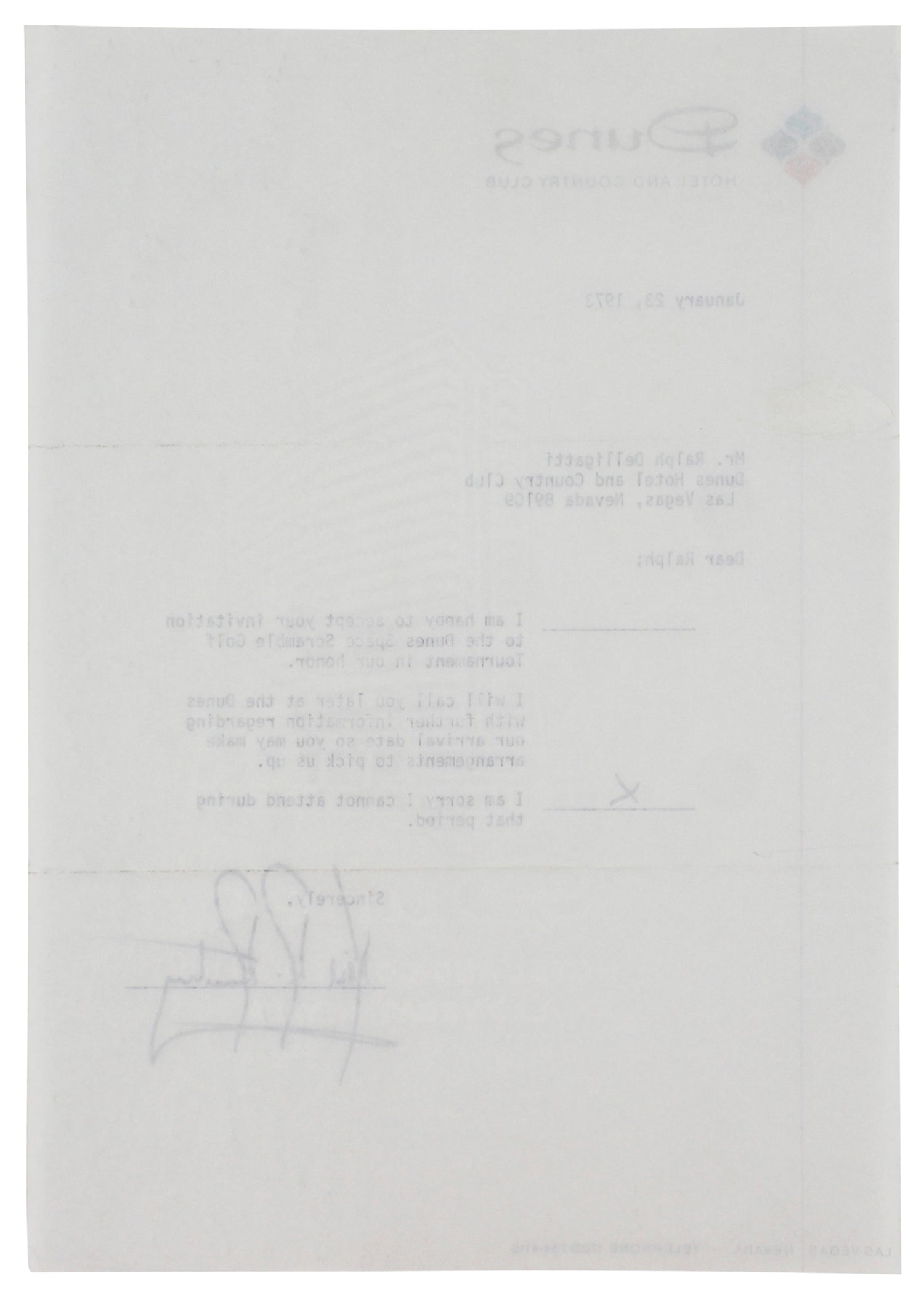 - Dated, Vintage Collectible – Signed on an official Dunes Hotel & Country Club letter, adding a unique historical touch.