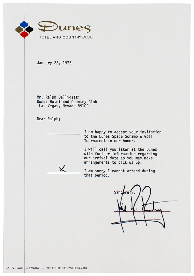 Own a remarkable piece of space exploration history with this Neil Armstrong Autographed Dunes Hotel & Country Club Letter, dated January 23, 1973. This rare collectible is personally signed by Apollo 11 astronaut Neil Armstrong, making it a must-have for space enthusiasts, history buffs, and serious autograph collectors.