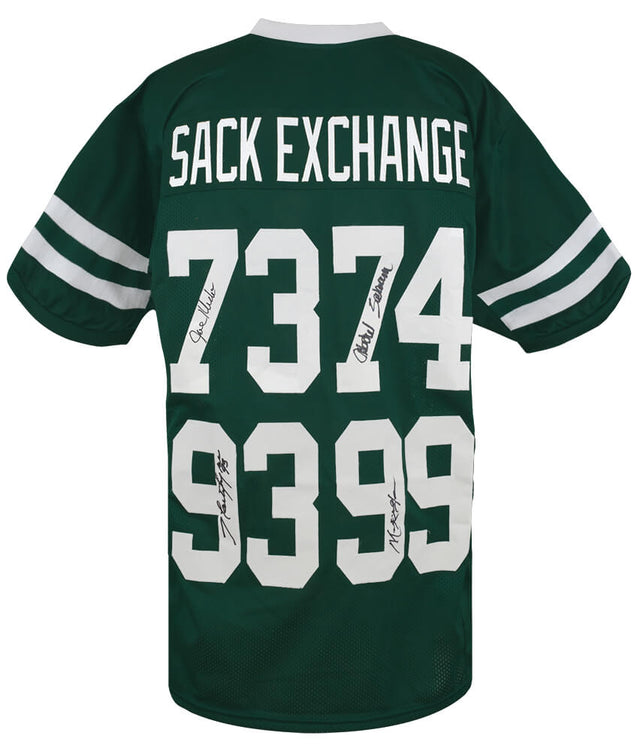 Own a piece of football history with this New York Sack Exchange signed green throwback custom football jersey, celebrating one of the most dominant defensive lines in New York Jets history. This exclusive collector’s item pays tribute to the legendary quartet of Mark Gastineau, Joe Klecko, Marty Lyons, and Abdul Salaam, who terrorized quarterbacks in the early 1980s.
