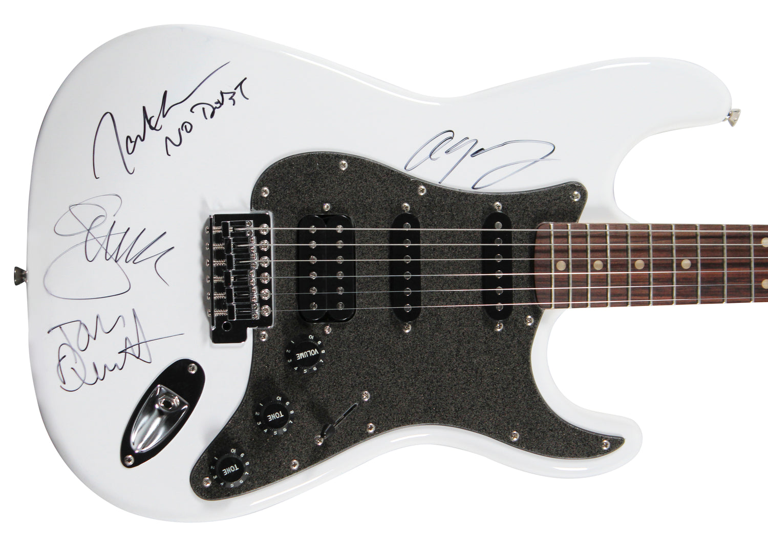 No Doubt, fronted by the iconic Gwen Stefani, shaped the '90s and early 2000s with their genre-blending sound and unforgettable hits like Don't Speak and Just a Girl. This signed Fender Stratocaster is a tribute to their lasting legacy, making it a prized centerpiece for any music lover's collection. Secure this one-of-a-kind artifact today!