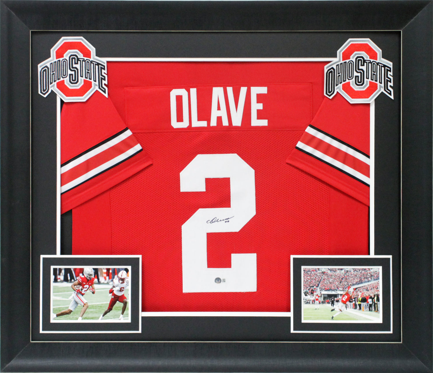 Elevate your Ohio State Buckeyes memorabilia collection with this Autographed Red Pro Style Framed Jersey, personally signed by Chris Olave. A standout wide receiver and fan favorite, Olave played a crucial role in Ohio State’s offense, making this signed jersey a must-have for serious Buckeyes fans and collectors. Key Features: