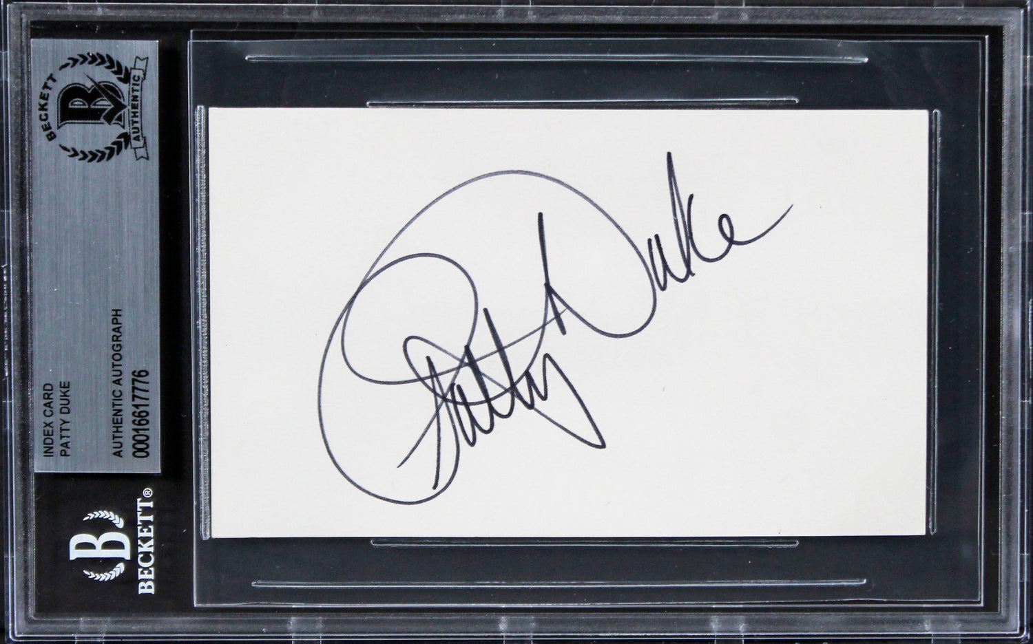 Own a piece of Hollywood history with this authentic autographed 3x5 index card, personally signed by Patty Duke, the Academy Award-winning actress renowned for her unforgettable performance as Helen Keller in The Miracle Worker. This collectible is 100% authentic, slabbed and certified by Beckett Authentication Services, ensuring its legitimacy for serious collectors and fans alike.