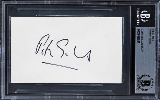 This Autographed 3x5 Index Card has been personally signed by Peter Gabriel, the legendary frontman of Genesis and an iconic solo artist. A must-have for music collectors and fans, this rare piece of memorabilia celebrates the career of one of rock’s most influential musicians. This item is 100% authentic, professionally slabbed and authenticated by Beckett Authentication Services (BAS), ensuring its legitimacy and long-term collectible value. Authentication can be verified directly on the Beckett Authentication Services website. Product Features: