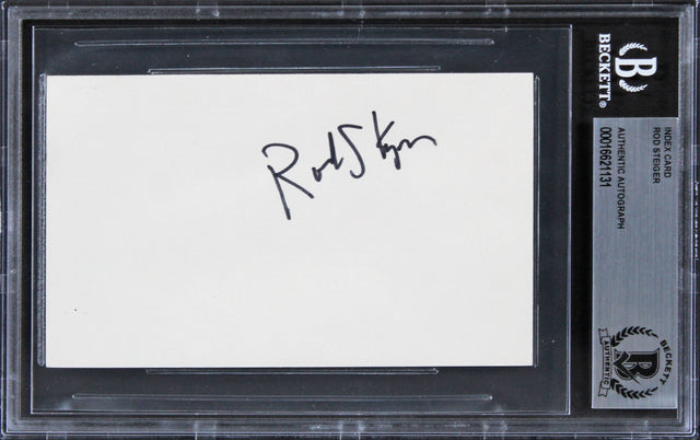 Own a piece of Hollywood history with this Autographed 3x5 Index Card, personally signed by Rod Steiger, the legendary actor best known for his Academy Award-winning role in In the Heat of the Night. A must-have collectible for film enthusiasts and memorabilia collectors alike, this signed index card is authenticated and slabbed by Beckett Authentication Services, ensuring its 100% authenticity.
