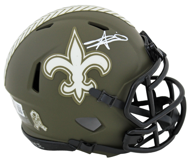 Own a piece of New Orleans Saints history with this Autographed Alternate Salute to Service Speed Mini Helmet, personally signed by star running back Alvin Kamara. This limited-edition collectible is a must-have for Saints fans and sports memorabilia collectors alike.
