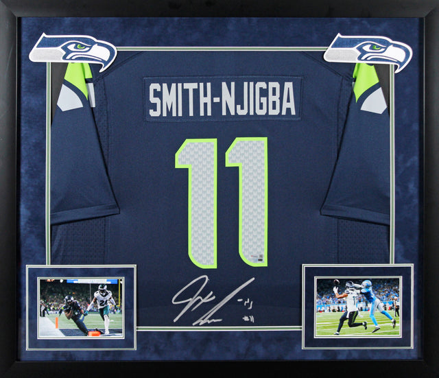 Own a piece of Seattle Seahawks history with this Autographed Navy Blue Nike Game Framed Jersey, personally signed by rising star Jaxon Smith-Njigba. This exclusive memorabilia is a must-have for any Seahawks fan or serious collector.