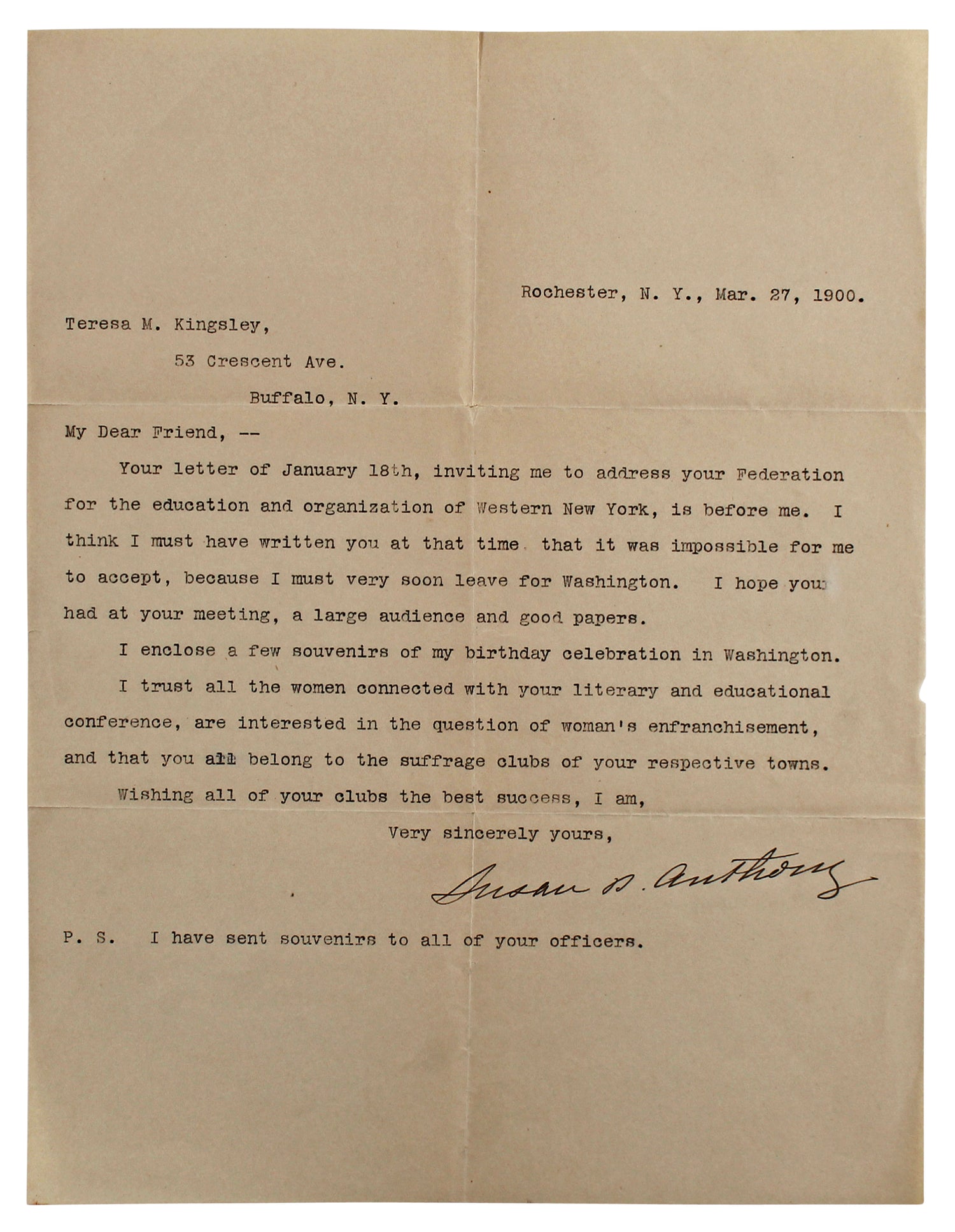 Susan B. Anthony Authentic Signed 8.25x10.75 1900 Letter BAS #AB14682