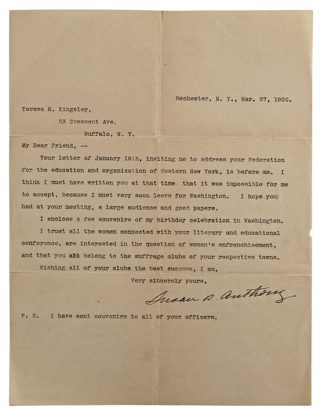 Own a rare piece of history with this Autographed Letter dated March 27, 1900, personally signed by Susan B. Anthony. A pivotal figure in the women's suffrage movement, Anthony’s legacy continues to inspire generations. This historic document is a must-have for collectors of political and cultural memorabilia.