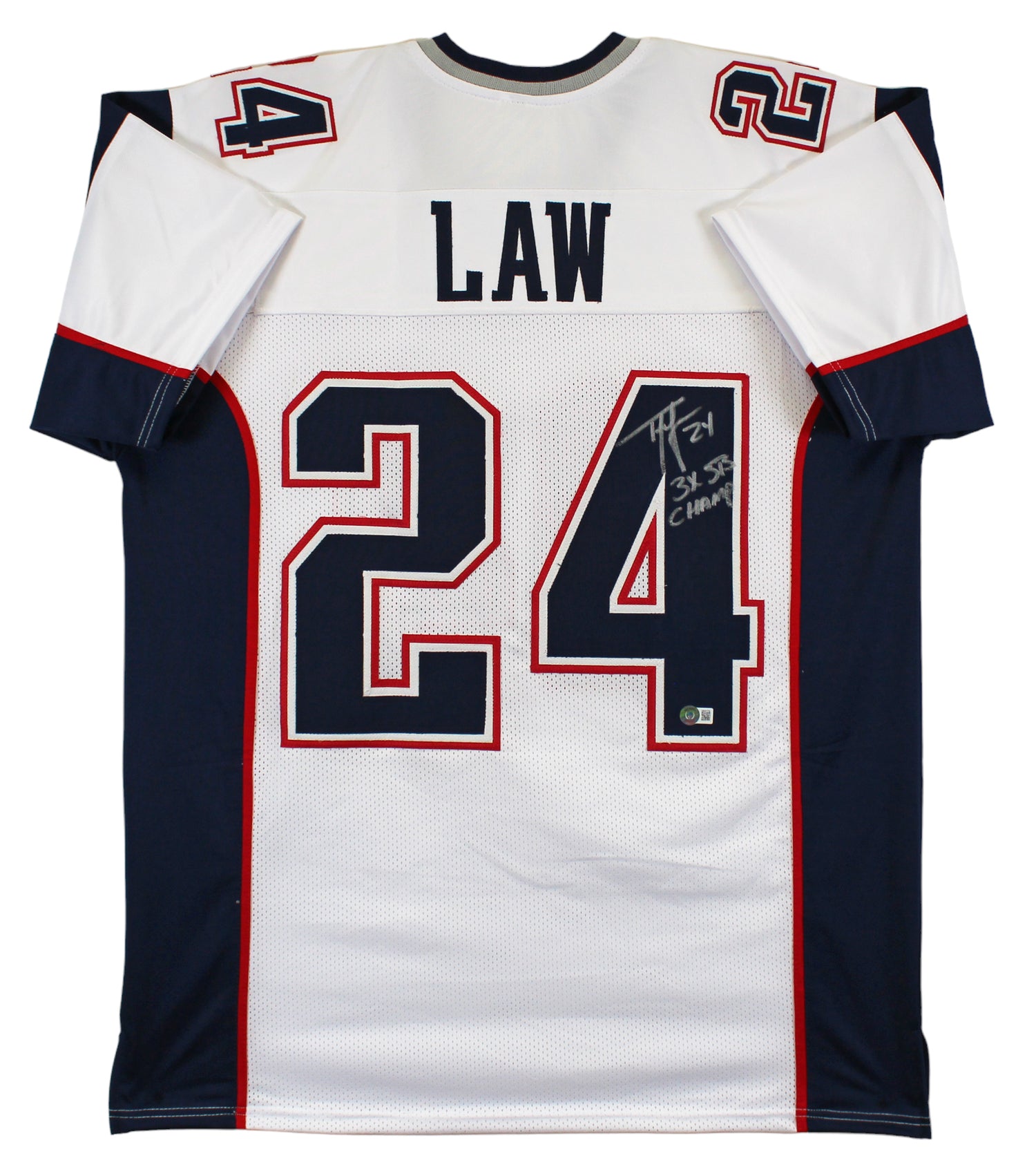 Own a piece of New England Patriots history with this Ty Law Autographed White Pro Style Jersey, featuring the special inscription "3x SB Champ." A must-have for dedicated Patriots fans and sports memorabilia collectors, this jersey is 100% authentic and comes with a Beckett Authentication Services (BAS) hologram for guaranteed legitimacy.