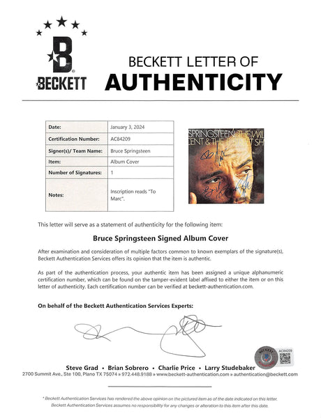 Bruce Springsteen "To Marc" Authentic Signed Album Cover W/ Vinyl BAS #AC84209