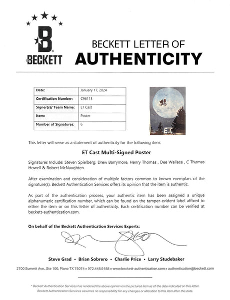 E.T. (6) Spielberg, Barrymore Signed 26.5x38.5 Linen Backed Poster BAS #C96113