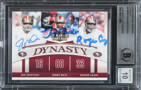 49ers Montana, Rice & Craig Signed 2008 Donruss Threads #6 Card Auto 10 BAS Slab